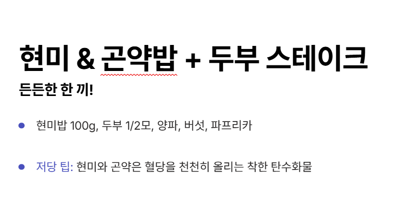 - 저당 팁: 현미와 곤약은 혈당을 천천히 올리는 착한 탄수화물! 두부는 훌륭한 식물성 단백질원입니다.