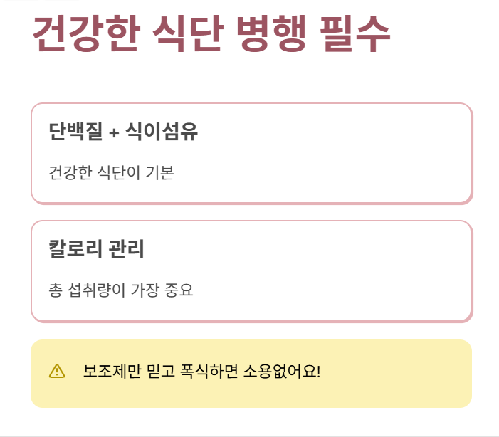 - 과대광고에 현혹되지 마세요: "OO만 먹으면 -10kg!", "굶지 않고 살 빠진다!" 같은 과대광고는 피하세요. 보조제는 마법의 약이 아닙니다.