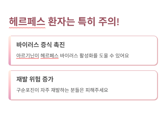 특정 질환을 앓고 있거나 약물을 복용 중인 경우, 아르기닌은 오히려 치명적인 독이 될 수 있습니다. 섭취 전 반드시 전문가와 상담해야 합니다.
