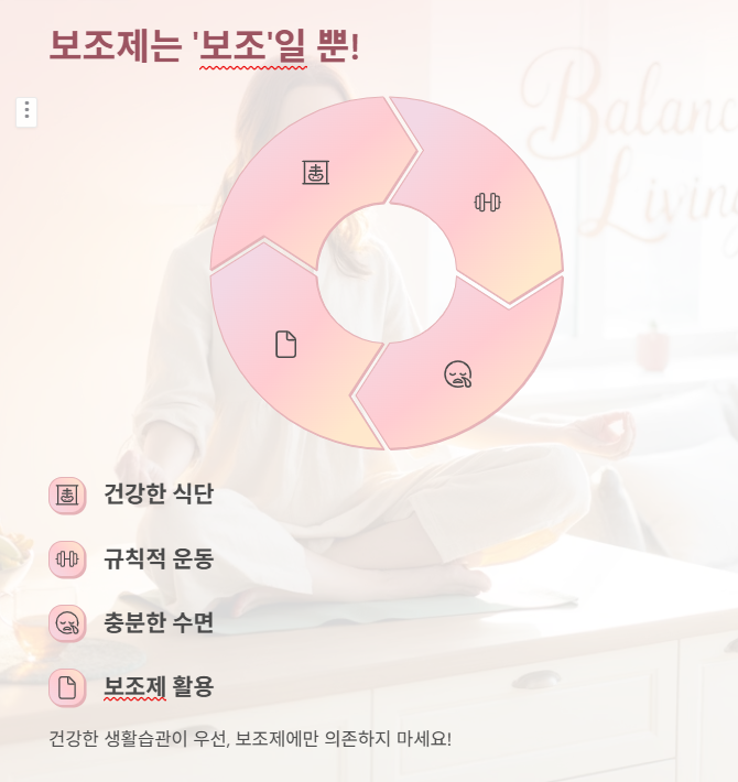 - 권장량 준수: 제품에 표기된 일일 권장량을 초과하여 섭취하지 않습니다. 욕심은 금물!