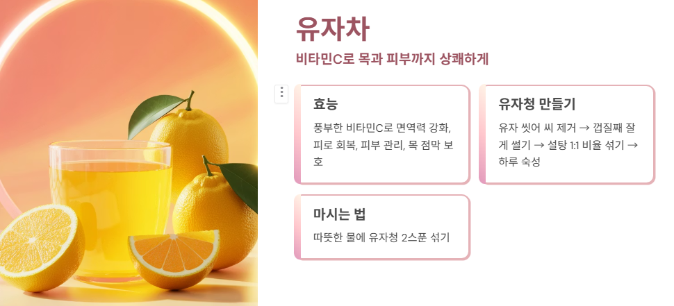 ① 효능 : 유자는 풍부한 비타민C 덕분에 면역력 강화, 피로 회복, 피부 관리에 효과적입니다. 건조한 환절기엔 목의 점막을 촉촉하게 보호해 줍니다. 상큼한 향은 기분까지 맑게 만들어 주죠.