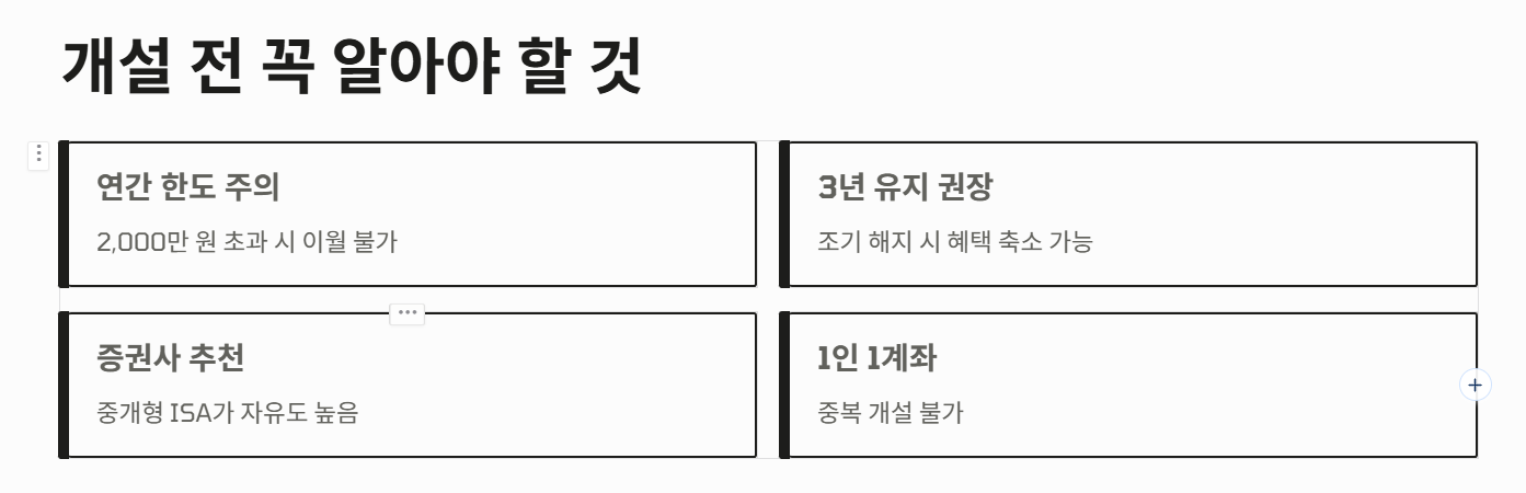 - ISA는 계좌를 여러 개 개설할 수 없으며 1인 1계좌