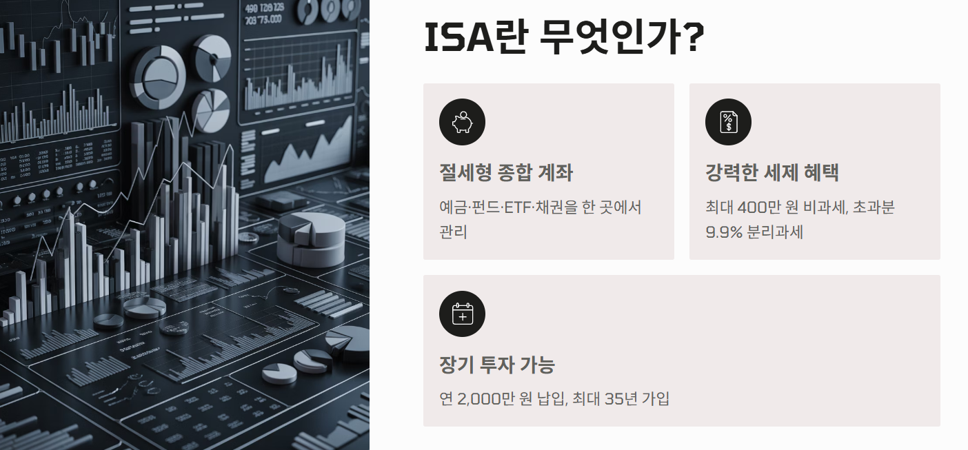 ISA는 개인 자산 관리를 위한 일종의 ‘절세 통장’으로, 예금·펀드·ETF·채권 등 다양한 상품에 투자할 수 있습니다.