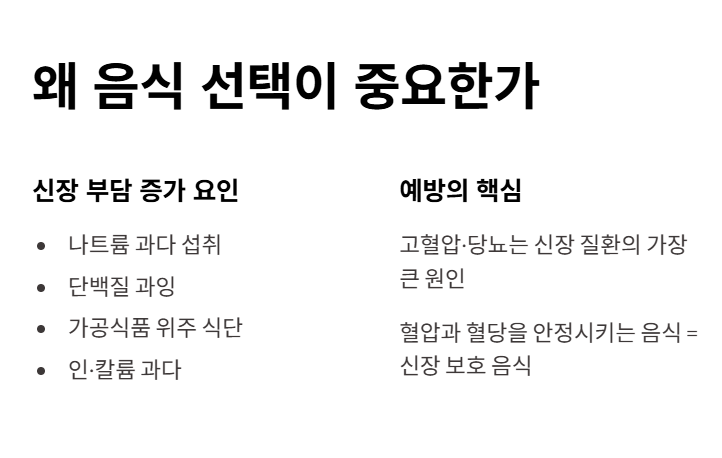 한 번 손상된 신장 기능은 쉽게 회복되지 않습니다. 따라서 치료보다 ‘예방’이 훨씬 중요하며, 그 핵심이 바로 식습관 관리입니다.