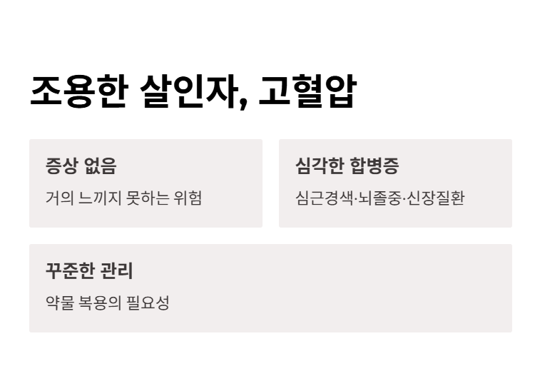 고혈압은 ‘조용한 살인자’라 불릴 만큼 증상이 거의 없지만, 방치할 경우 심근경색·뇌졸중·신장질환으로 이어질 수 있는 위험한 질환입니다.