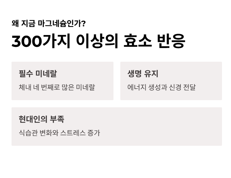 마그네슘은 우리 몸에서 300가지 이상의 효소 반응에 관여하는 필수 미네랄입니다.