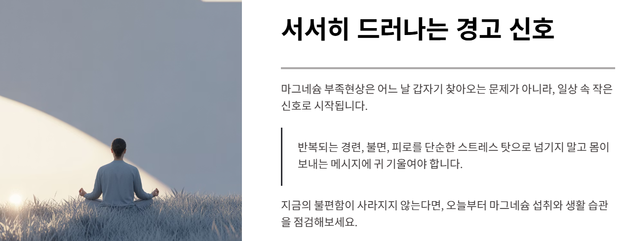 이러한 증상은 다른 원인으로 오해되기 쉬워 마그네슘 결핍이 더 오래 방치되는 경우가 많습니다.