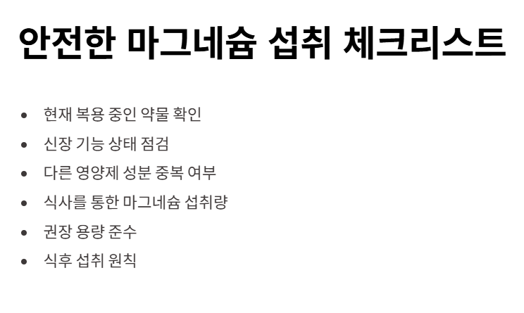 특히 신장 기능이 저하된 상태에서는 마그네슘 배출이 원활하지 않아 체내 축적 위험이 큽니다.