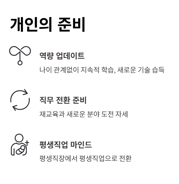 개인 차원에서는 나이에 관계없이 지속적으로 역량을 업데이트하고, 직무 전환이나 재교육에 대한 준비가 필요합니다. 정년이 늘어난다고 해서 자동으로 안정이 보장되는 시대는 아니기 때문입니다.