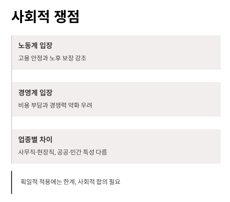 또한 동일 정년 적용이 모든 업종과 직무에 적합한가에 대한 논쟁도 계속되고 있습니다. 사무직과 현장직, 공공과 민간의 특성이 다르기 때문에 획일적 적용에는 한계가 있다는 지적도 있습니다.