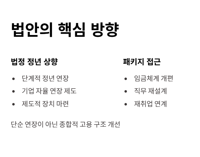특히 임금이 연공서열 중심인 구조에서는 정년연장이 비용 상승으로 직결됩니다. 이 때문에 정년연장법안 발의와 함께 임금피크제, 직무급제 개편 등이 함께 논의되고 있습니다.