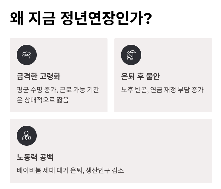 특히 베이비붐 세대가 대거 은퇴 시기에 접어들면서 노후 빈곤, 연금 재정 부담, 노동력 공백 문제가 동시에 대두되었습니다. 이러한 상황에서 정년연장은 더 이상 선택이 아닌 대안으로 떠오르고 있습니다.