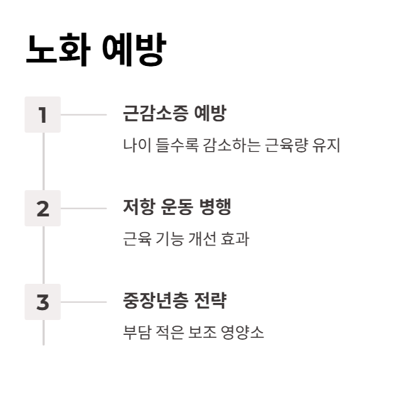 크레아틴은 저항 운동과 병행 시 근육 유지와 기능 개선에 도움을 줄 수 있어, 노화로 인한 신체 기능 저하 예방 측면에서도 기대를 받고 있습니다.