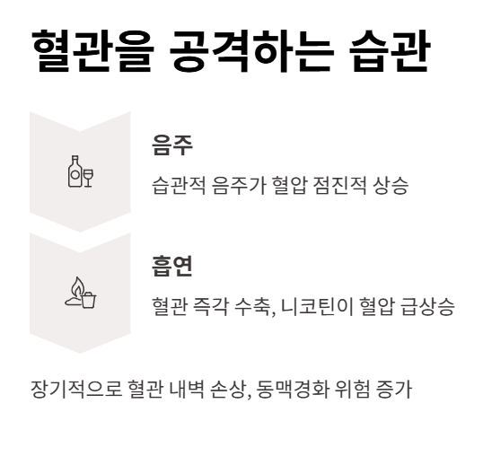흡연과 음주는 혈압 관리에 치명적입니다. 줄이는 것만으로도 혈압 개선 효과가 큽니다.