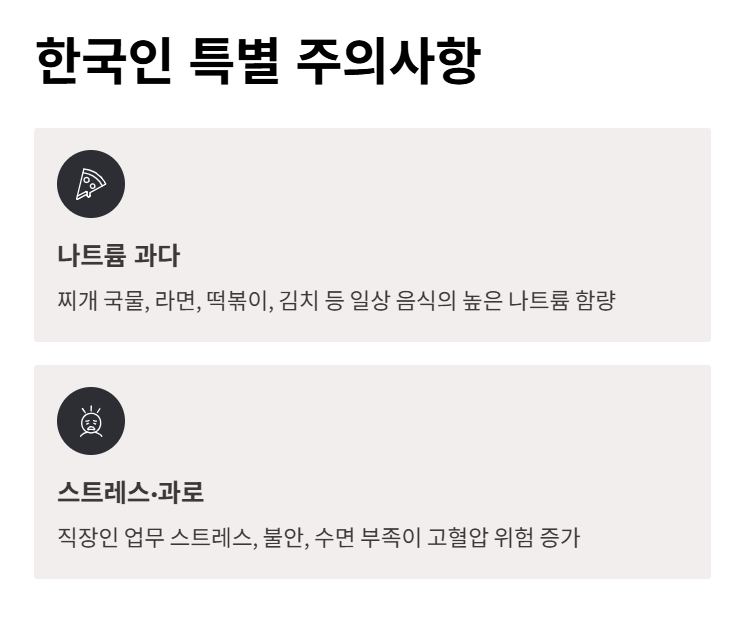 한국인의 식문화와 생활 패턴 특성상 다음 두 가지는 매우 중요한 위험 요인입니다.