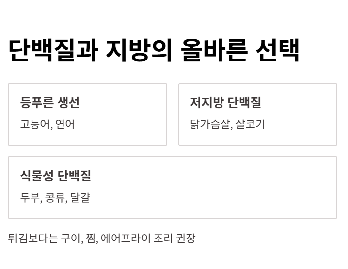 단백질은 혈당을 급격히 올리지 않으면서 포만감을 유지해주는 중요한 영양소입니다. 다만 지방 함량과 조리 방식에 주의해야 합니다.