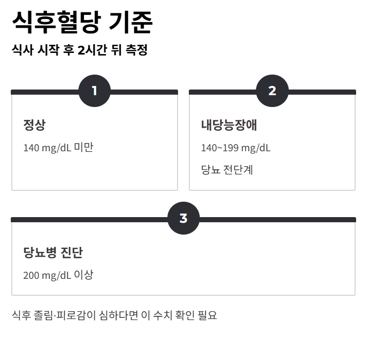 식후혈당은 식사 시작 후 2시간 뒤 측정한 혈당 수치로, 실제 일상생활에서 혈당이 어떻게 반응하는지를 보여줍니다.