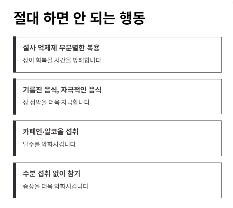 장염은 장이 회복될 시간을 주는 것이 중요하며, 무리한 활동은 증상을 악화시킬 수 있습니다.