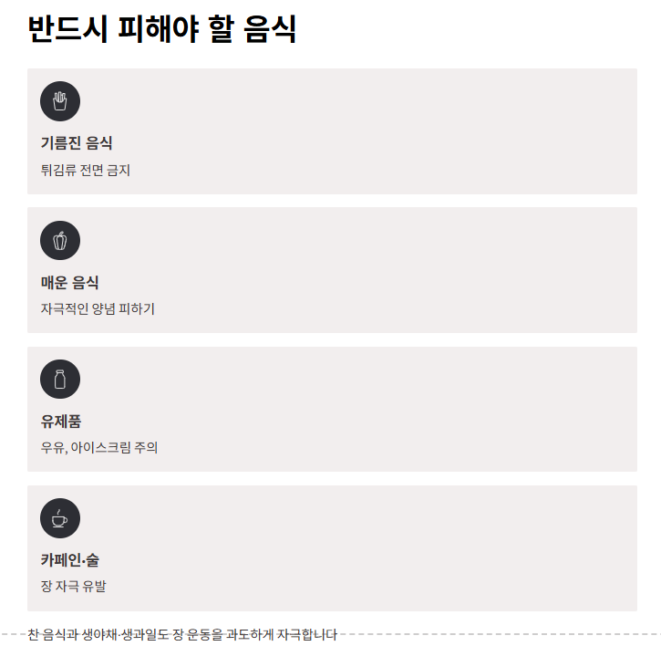 특히 찬 음식과 자극적인 음식은 장 운동을 과도하게 자극해 증상을 악화시킬 수 있습니다.
