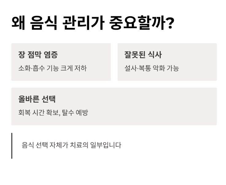 반대로 자극이 적고 소화가 쉬운 음식을 섭취하면 장이 회복될 시간을 벌 수 있으며, 탈수와 영양 결핍을 예방하는 데도 도움이 됩니다. 즉, 음식 선택 자체가 치료의 일부라고 볼 수 있습니다.