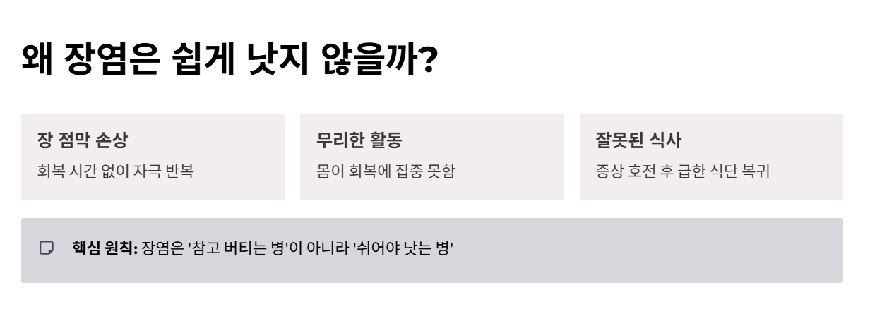 장염이 쉽게 낫지 않는 가장 큰 이유는 장이 회복할 시간을 충분히 주지 않기 때문입니다. 증상이 조금 나아졌다고 바로 평소 식사로 돌아가거나, 무리해서 일을 계속하면 장 점막이 다시 자극을 받게 됩니다.