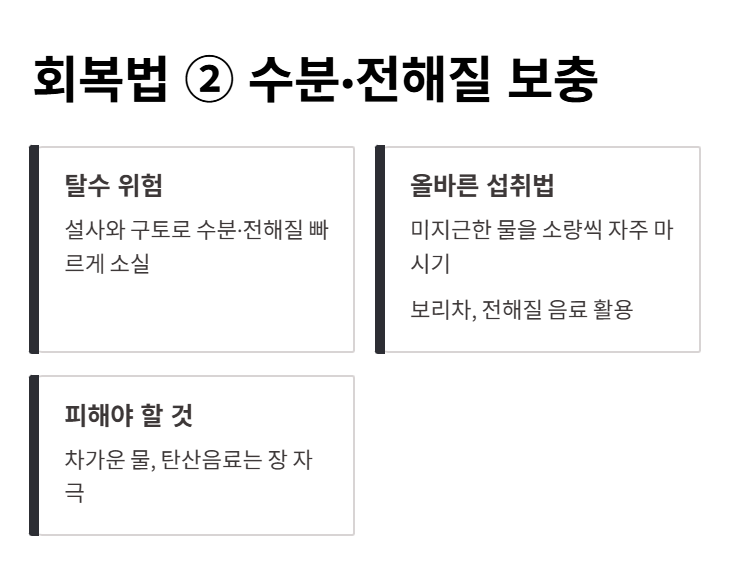 설사와 구토가 반복되면 체내 수분과 전해질이 빠르게 소실됩니다. 탈수 상태가 되면 회복이 느려질 뿐 아니라 어지럼증, 심한 피로감을 유발할 수 있습니다.