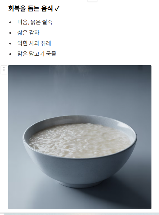 A. 완전히 굶기보다는 미음이나 죽처럼 부담 없는 음식을 소량 섭취하는 것이 회복에 도움이 됩니다.