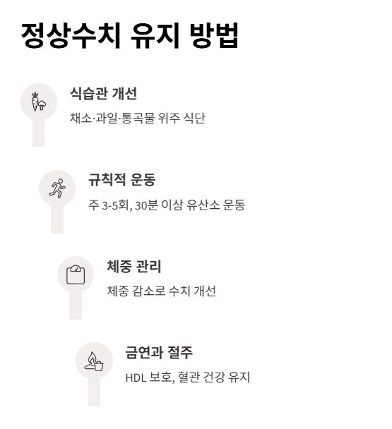 특히 중년 이후에는 생활습관 변화 없이도 수치가 자연스럽게 올라갈 수 있어 정기적인 관리가 필요합니다.