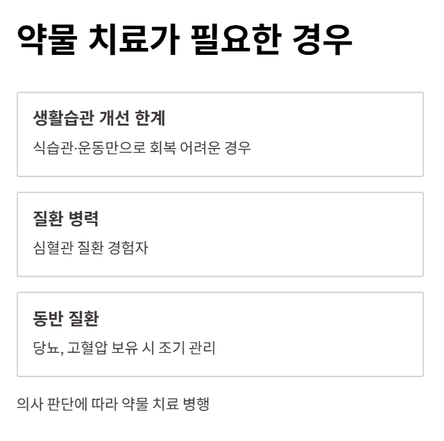 생활습관 개선만으로 콜레스테롤 정상수치 회복이 어려운 경우, 의사의 판단에 따라 약물 치료가 필요할 수 있습니다.