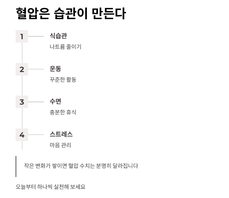 오늘부터 식습관, 운동, 수면, 스트레스 관리까지 하나씩 실천해 보세요. 작은 변화가 쌓이면 혈압 수치는 분명히 달라질 것입니다.