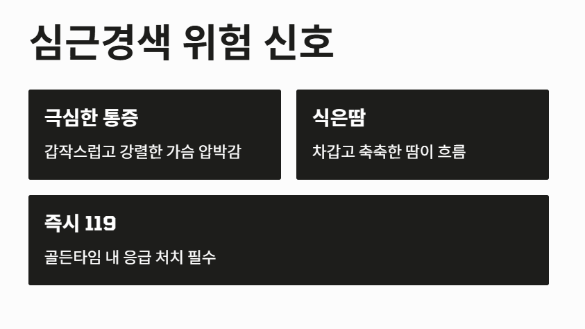 심근경색은 심장 혈관이 완전히 막혀 심장 근육이 손상되는 응급 질환입니다. 왼쪽 가슴을 쥐어짜는 듯한 극심한 통증이 20분 이상 지속되며, 왼쪽 팔·어깨·턱·등으로 통증이 퍼질 수 있습니다.