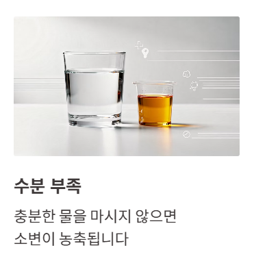 또한 물을 충분히 마시지 않은 상태에서는 소변이 농축되면서 거품이 더 잘 생길 수 있습니다. 이 경우 수분 섭취를 늘리면 자연스럽게 개선되는 경우가 많습니다.+